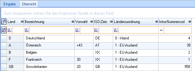 Elk land dient bij ‘Selectie:’ een toewijzing te krijgen. Deze is noodzakelijk voor het toekennen van een BTW-tarief. De status ‘0 – Binnenland’ mag slechts aan één land toegekend worden. Dit kan gecontroleerd worden door op het tabblad ‘Overzicht’ een groepering op ‘Landtoewijzing’ toe te passen. Daardoor is eenvoudig te zien dat er aan slechts één land een landtoewijzing ‘0 – Binnenland’ is toegekend.