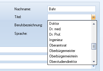 Einem Ansprechpartner kann durch Auswahl in der Titel-Combobox ein Titel zugewiesen werden. Analog ist dies für Mitarbeiter möglich.