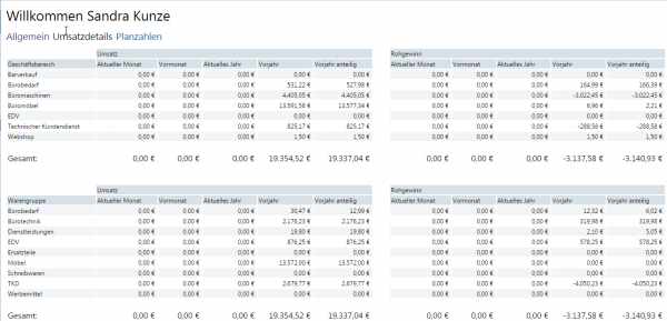 zeigt eine aufgeschlüsselte Umsatzauswertung nach z.B. Geschäftsbereichen und Warengruppen