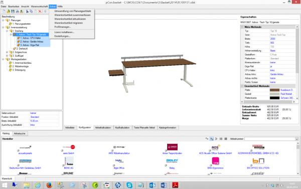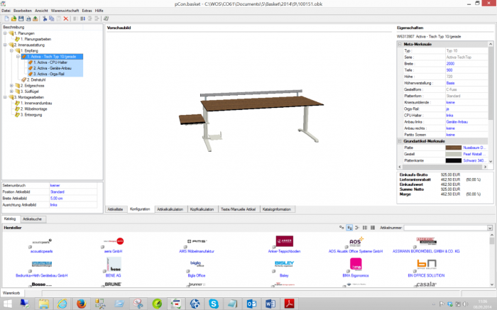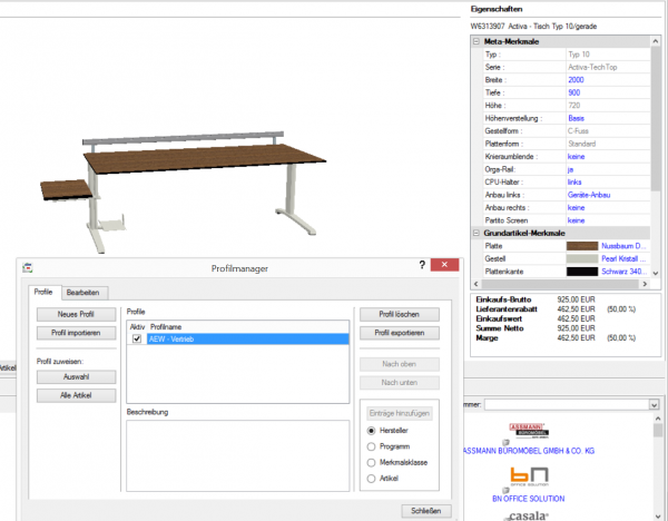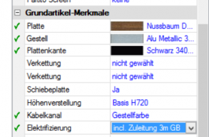 Dies lässt sich am besten an einem kleinen Beispiel aufzeigen: Zukünftig soll Nussbaum für die Serie Activa beim Kunden voreingestellt sein. Gestell soll Alu Metallic sein, die Plattenkante in Schwarz. Der Kunde kauft diesen Tisch immer mit einer Elektrifizierung.