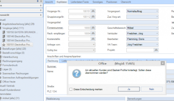 Damit das Profil auch nach dem Schließen des Angebots aufrufbar ist, kann es direkt mit dem Kunden verknüpft werden. Hierzu wird die Firma in Concept Office geöffnet, und der Button „Basket-Profile“ unter „Mitarbeiter/Weiteres“ angeklickt. Das Profil steht hier in der Auswahlbox zur Verfügung. Nach der Zuordnung steht das Profil sofort für alle bestehenden und neuen Vorgänge zu Verfügung. Löscht man die Zeile wieder, ist das Profil inaktiv.