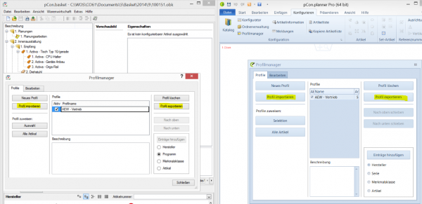 Ja, dies ist möglich. Sowohl im Profilmanager im pCon.basket als auch im pCon.planner gibt es eine Im-/Exportfunktion. Es wird jeweils eine Datei erzeugt, die im anderen Programm wieder eingelesen werden kann.
