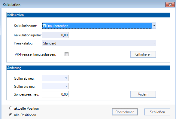 Über die Schaltfläche Positionen kalkulieren wird die Kalkulationsmaske geöffnet. Hier kann der aktuell markierte Datensatz oder die markierten Datensätze bzw. alle Datensätze bearbeitet werden.