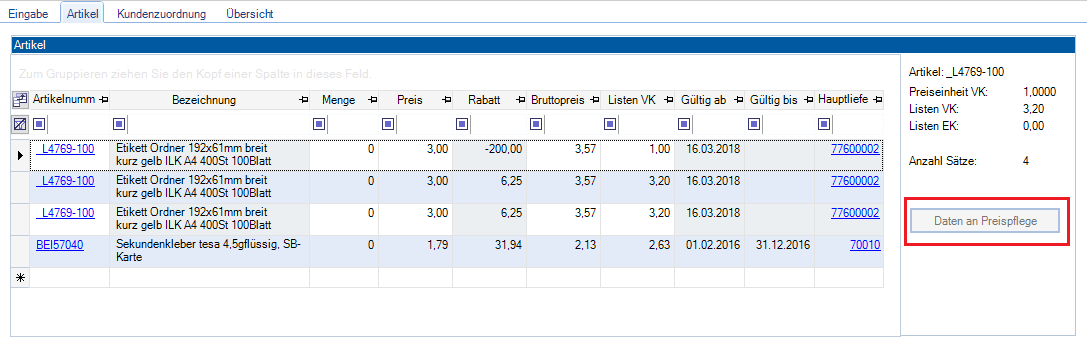 Im Modul Preiskatalog besteht die Möglichkeit im Reiter Artikel, nachdem ein Katalog ausgewählt wurde, über die gleichnamige Funktion Daten an die Preispflege zu übergeben.