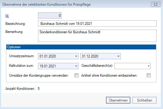 - Geschäftsbereich (Die auszuwertenden Umsätze bei der Übernahme der selektierten Konditionen für die Preispflege können auf ausgewählte Geschäftsbereiche eingeschränkt werden.)