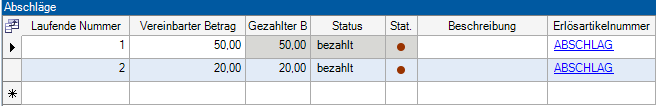 Nach dem Buchen dieser Abschlagszahlungen wird der gezahlte Betrag in die Bestellung (Abschnitt Abschläge) eingetragen. Der Status wechselt dann auf „bezahlt“.