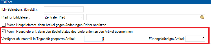 Um mit der Soennecken-Bestandsabfrage eine Verkaufssperre an einem Artikel setzen zu können, so muss am Lieferanten im Abschnitt EDIFact der Reiterkarte Lieferantendaten der Haken auf das Feld 'Wenn Hauptlieferanten, dann den Bestellstatus des Lieferanten an den Artikel übernehmen‘ gesetzt sein. Diese Option kann Artikelweise im Artikelstamm wieder entsperrt werden und greift somit nicht für einzelne Artikel.