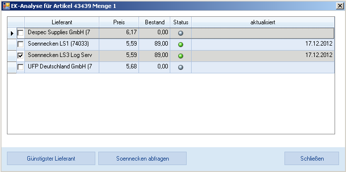 Ruft man einen Artikel im Modul Bestellvorschläge auf, hat man ebenfalls die Möglichkeit die Funktion „EK-Analyse“ zu nutzen. Im sich öffnenden Fenster werden alle für diesen Artikel verfügbaren Lieferanten angezeigt. Neben dem aktuellen EK (KIP) wird nach Klick auf „Soennecken abfragen“ der bestand und der Status angezeigt. Auch hier wird zusätzlich das Datum der letzten Abfrage aufgeführt.