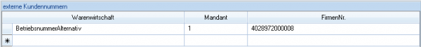 Für die Zentralregulierung (Soennecken) sind am Lieferanten die Betriebsnummern zu hinterlegen (Registerkarte „Weiteres“ dort im Bereich Betriebsnummer. Ist eine Betriebsnummer vorhanden und die Lieferanten-Rechnungen werden mit einer abweichenden Betriebsnummer geliefert, dann ist hier zusätzlich unter „externe Kundennummern“ ein Eintrag vorzunehmen. (Die Warenwirtschaft muss, wie im Bild gezeigt, exakt BetriebsnummerAlternativ heißen.)