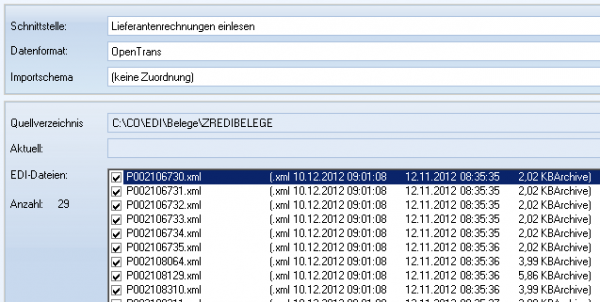 Im Modul „Lieferanten Rechnungen“ kann immer nur eine Bestellung zu einem gelieferten Rechnungs-Datensatz zugeordnet werden. Werden in einer Datei mehrere Bestellungen zusammengefasst, so muss diese Rechnung über das Modul Rechnungseingang gebucht werden. In diesem Fall wird der Status des Lieferanten-Belegs auf „extern gebucht“ gesetzt.