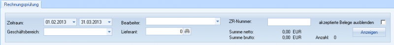 Zudem können geprüfte Belege ausgeblendet werden. Als geprüfte Belege gelten dabei Belege mit dem Status „extern gebucht“, oder „Freigeben f. Fibu“, bei denen keine Reklamation (offene Belastungsanzeige) vorliegt und keine Nacharbeit im Kundenauftrag nötig ist. Durch Klick auf die Schaltfläche „Anzeigen“ werden die selektierten Belege angezeigt.