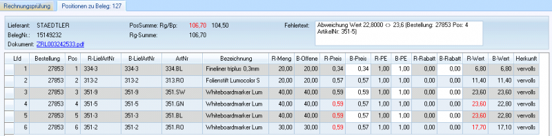 Durch Doppelklick auf eine Zeile gelangt man in die Positionen. Dort werden die gefundenen Unstimmigkeiten in Rot dargestellt. Im Bild unten sind bei 3 Positionen die Preise nicht identisch.