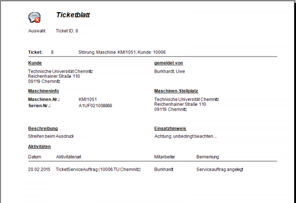 - Ist eine Maschinen im Ticket hinterlegt, so werden die Maschinennummer und Seriennummer, sowie der Stellplatz angezeigt.