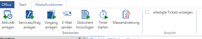 Wird mit der Übernahme des Tickets in den Service-Auftrag das Ticket abgeschlossen, so wird im Ticket der Status auf erledigt gesetzt.