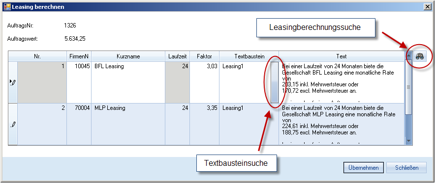 Nach Betätigung der „Übernehmen“-Taste werden die Texte als Textpositionen in den Vorgang übernommen. Diese Texte werden für den Ausdruck auf Angebot und Auftragsbestätigung gekennzeichnet. Zusätzlich wird eine interne Textposition erzeugt, die die Eckdaten der Leasingkalkulation beinhaltet, um später nachvollziehen zu können auf welcher Grundlage die Berechnung erfolgte.