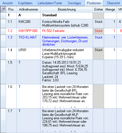 - Leasingtextbausteine sind nur in der Concept Office Positionsliste ersichtlich.