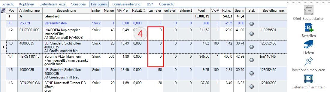 Außerdem kann hier die zu liefernde Menge storniert werden.