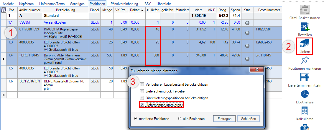 Die zu stornierenden Artikel werden unter dem Reiter Positionen aufgerufen und markiert (1). Durch die Aktivierung des Button Liefern (2) öffnet sich das Fenster Zu liefernde Menge eintragen (3). Dort wird abschließend die Combo-Box Liefermengen stornieren entsprechend mit Häkchen versehen. Möchten Sie alle Positionen stornieren, wird stattdessen auf alle Positionen gesetzt.