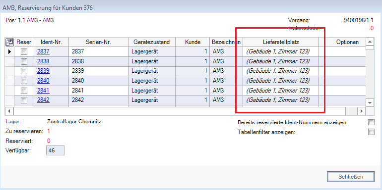 Nachdem die Maschine unter Positionen im Vorgang aufgenommen wurde, kann bei der Maschinenreservierung der Lieferstellplatz angegeben werden. Zum nachfolgenden Dialog gelangen Sie durch Rechtsklick auf die Maschine und anschließender Auswahl von „Identartikel reservieren“.