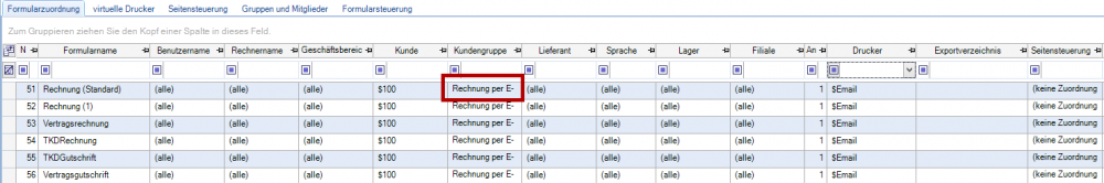 Um auch über die Module Formulardruck und Vertragsabrechnung Rechnungen per Mail versenden zu können, wird im Druckmanager eine Kundengruppe benötigt (Achtung, gemeint ist nicht die Kundengruppe am Kunden selbst!).