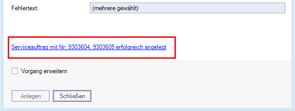 Wenn Sie den Service-Auftrag anlegen, erscheint im unteren Teil der Vorlaufsmaske ein blauer Link mit der Nummer des Auftrages. Mit diesem Link können Sie direkt in den Auftrag wechseln.