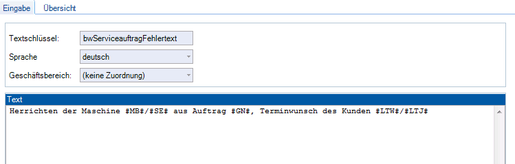 Der Hinweistext kann über das Modul Textbausteine unter Weitere Stammdaten gesteuert werden. Hierfür öffnen Sie das Modul und suchen nach dem Textschlüssel ‚bwServiceauftragFehlertext‘.