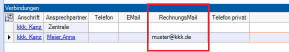 Die Portal-E-Mail wird ebenfalls im Modul Firmen eingetragen. Dafür öffnen Sie den Reiter „Eingabe“. Unter „Verbindungen“ wird die Ziel-Email in der Spalte „RechnungsMail“ hinterlegt.