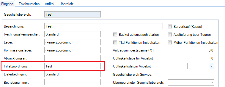 Es wird geprüft, ob der im Auftrag bzw. Vertrag hinterlegte Geschäftsbereich (am Vertrag: der Geschäftsbereich für Miete, Wartung oder Klicks, je nach dem was im Vertrag hinterlegt wurde) auf eine Filiale verweist.