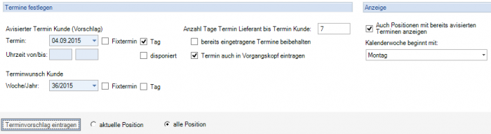 Über diese Funktion können Sie einen oder mehrere effektive Auslieferungstermine ermitteln. Durch die Schaltfläche Terminvorschlag eintragen wird der von Ihnen avisierte Termin in die Positionen des Auftrags übernommen. Möchten Sie einen bereits eingetragenen Termin überschreiben, so ist der Haken im Kästchen bereits eingetragene Termine beibehalten zu entfernen. Der Haken disponiert ist ein Kennzeichen für Sie, dass die Terminplanung soweit abgeschlossen, und der Kunde über den Termin informiert wurde.