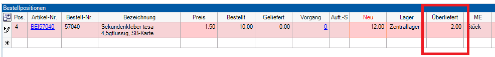 Die Position in der Bestellung im Abschnitt Bestellpositionen wird nun rot hervor gehoben und in die Spalte „Überliefert“ wird die Menge eingetragen, die zu viel geliefert wurde. Im nachfolgenden Beispiel wurden 10 Artikel bestellt und 12 geliefert, wodurch die Differenz 2 in die Spalte eingetragen wurde.