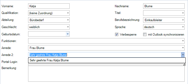 Bei der Anlage oder Pflege von Ansprechpartnern kann man aus den angelegten Anreden auswählen. In der Auswahl werden die im Text enthaltenen Platzhalter mit den Echtdaten ersetzt.