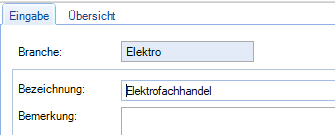Durch Klick auf Neu wird das Feld Branche freigeschalten. Nun ist die Eingabe einer neuen Branche möglich. Dieser Name darf maximal 20 Zeichen lang sein und muss eindeutig gewählt werden. Anschließend gibt man im Feld Bezeichnung eine treffende Benennung ein, die später bei der Auswahl der Branchen verwendet werden soll.