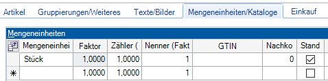 Im Modul Artikel, Reiter „Mengeneinheiten/Kataloge“ kann einem Artikel die gewünschte Mengeneinheit zugewiesen werden. Die Mengeneinheiten stehen per Drop-down zur Auswahl.