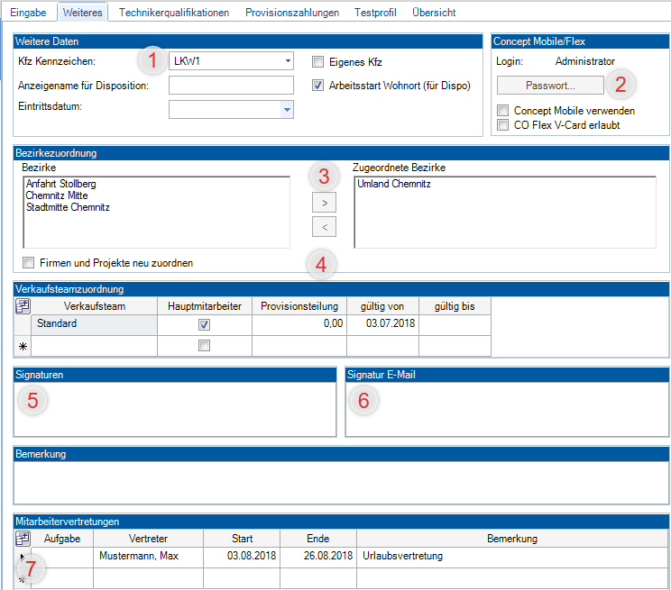 - Festlegung der Zugehörigkeiten zu Bezirken (3) und Verkaufsteam (4)