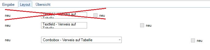 Das Profilfeld Textfeld - Verweis auf Tabelle ist mit einer Matchcode-Suche ausgestattet. Für das Ergebnis der Suche wurde hinter dem Feld im Layout Platz reserviert. Gleiches gilt für das Profilfeld Combobox - Verweis auf Tabelle . Hier wird der Platz für den Eintrag aus der Box reserviert. Dieser Platz ist bei der Erstellung des Layouts nicht sichtbar. Es muss mindestens die Breite des Feldes als Abstand eingehalten werden.