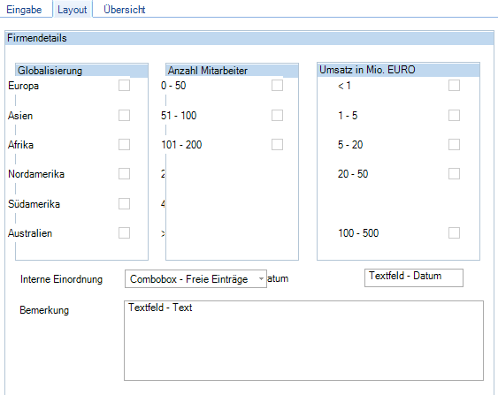 Das Profilfeld Textfeld - Verweis auf Tabelle ist mit einer Matchcode-Suche ausgestattet. Für das Ergebnis der Suche wurde hinter dem Feld im Layout Platz reserviert. Gleiches gilt für das Profilfeld Combobox - Verweis auf Tabelle . Hier wird der Platz für den Eintrag aus der Box reserviert. Dieser Platz ist bei der Erstellung des Layouts nicht sichtbar. Es muss mindestens die Breite des Feldes als Abstand eingehalten werden.