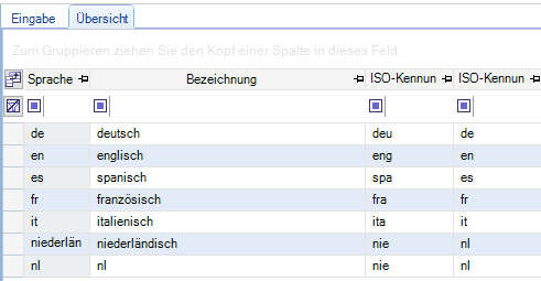 Über den Klick auf Neu kann eine neue Sprache angelegt werden. Das Feld Sprache ist der Schlüssel des Datensatzes und muss daher eindeutig sein. Er darf bis zu 30 Zeichen lang sein.