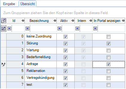 Dabei kann festgelegt werden, ob eine Ticketart aktiv sein soll. Weiterhin kann mit der Option In Portal anzeigen gesteuert werden, ob diese Ticketart bei der Meldung von Störungen über das Concept Customer Portal zur Verfügung steht.