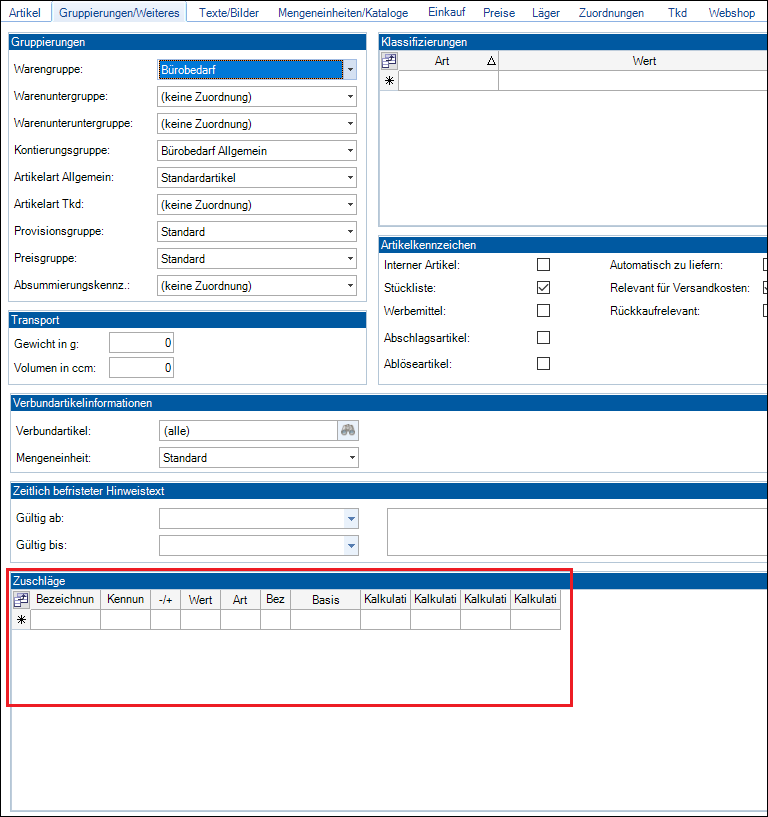 Im Artikelstamm können einem Artikel Zuschläge fest zugewiesen werden.