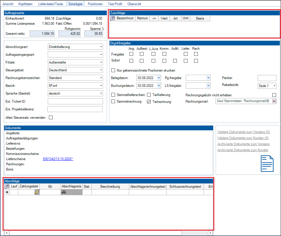 In der Vorgangsbearbeitung, Registerkarte Sonstiges, unter Rabatte und Zuschläge können Sie nun die gepflegten Datensätze auswählen. Sie können dort auch Wert und Art eines Abschlages ändern.