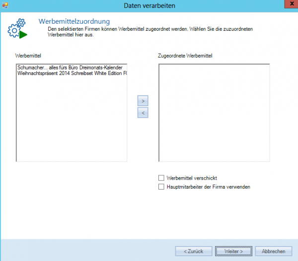 Werbemittel können auch über die Übersicht verarbeitet werden. Klicken Sie dafür auf die Modulfunktion Daten verarbeiten um den Assistenten zu starten. Wählen Sie hier den Punkt Den selektierten Firmen ein Werbemittel zuordnen (…) und gegebenfalls auch einen Haken bei der Für die selektierten Daten eine Aktivität anlegen und klicken Sie auf Weiter.