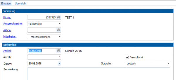 Das Werbemittel (Katalog, Warenprobe etc.) muss als Artikel angelegt sein. Das Werbemittel hat beim Versand keinen Verkaufspreis. Der eventuell bestehende Verkaufspreis wird beim Versand als Werbemittel automatisch genullt.