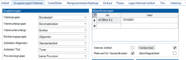 Dieser Artikel muss in der Registerkarte Mengeneinheiten/Sonstiges als Werbemittel aktiviert werden.