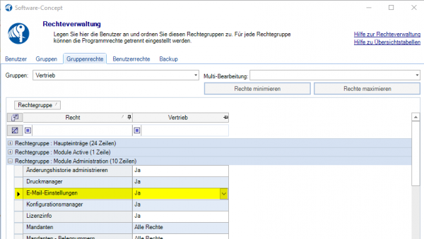 Zuerst müssen Sie dem entsprechenden Mitarbeiter oder der entsprechenden Gruppe das Recht für den neuen Dialog ‚E-Mail-Einstellungen‘ zuweisen.